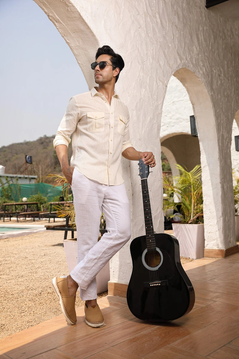 Introducing our Summer Breeze collection: this linen-cotton shirt features double inverted pleated flap pockets. It combines the elegance of Bavarian Cream color with the zing of double pockets. The blend of cotton and linen fabric ensures durability and comfort, perfect for warm days.