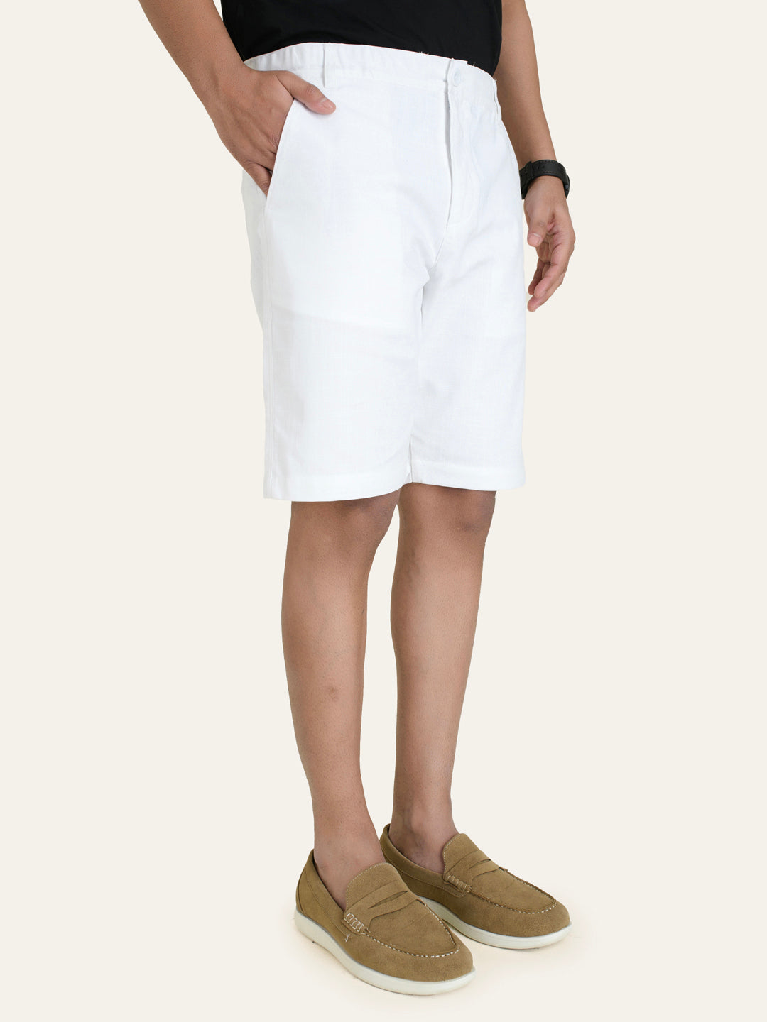 White Solid Mid Rise Regular Fit Casual Shorts. Has a Mid Rise, Flat Front, Two Back Pocket and Two Front Pocket, Button Closure, Zipper Fly and Linen Cotton Fabric.