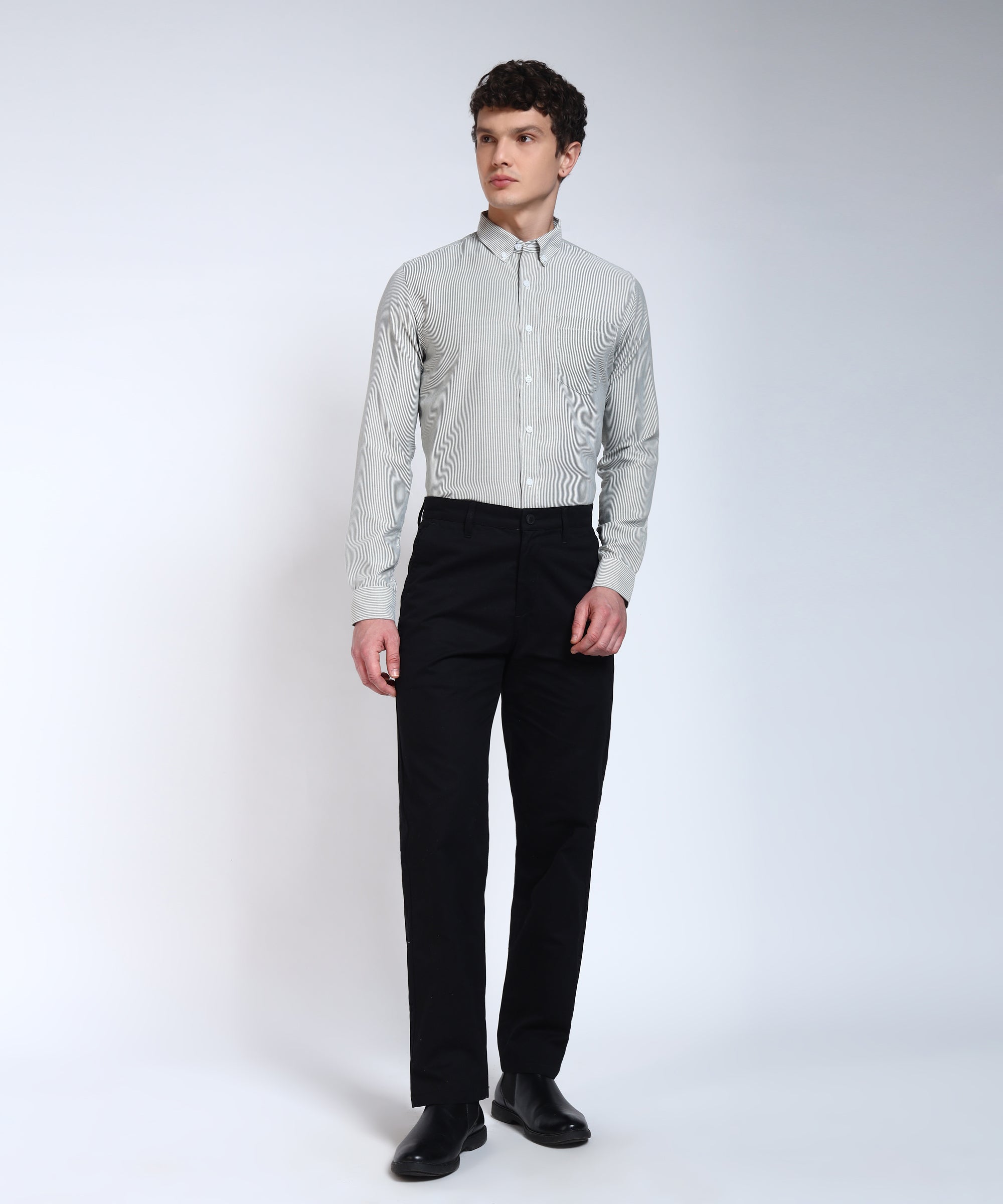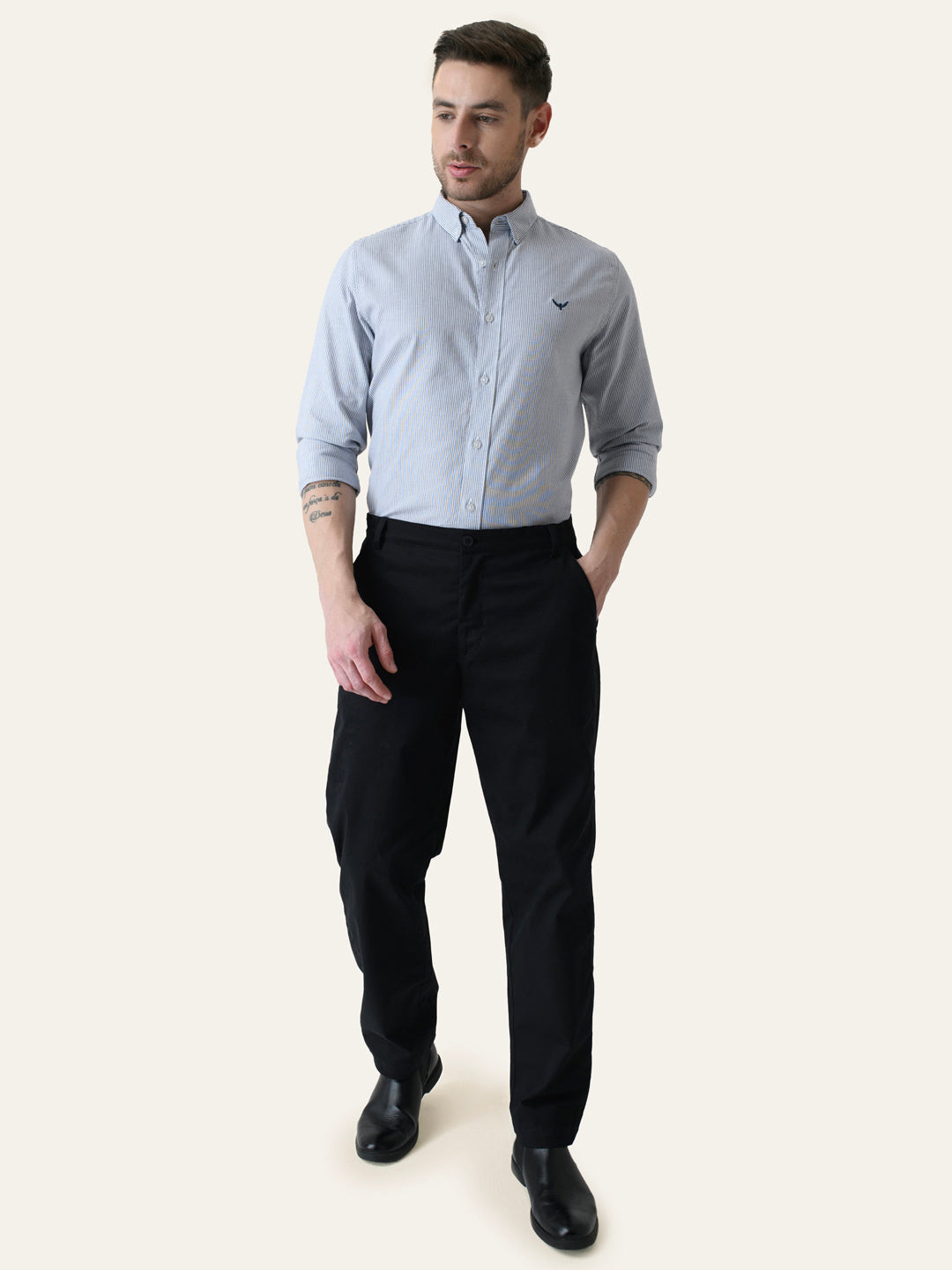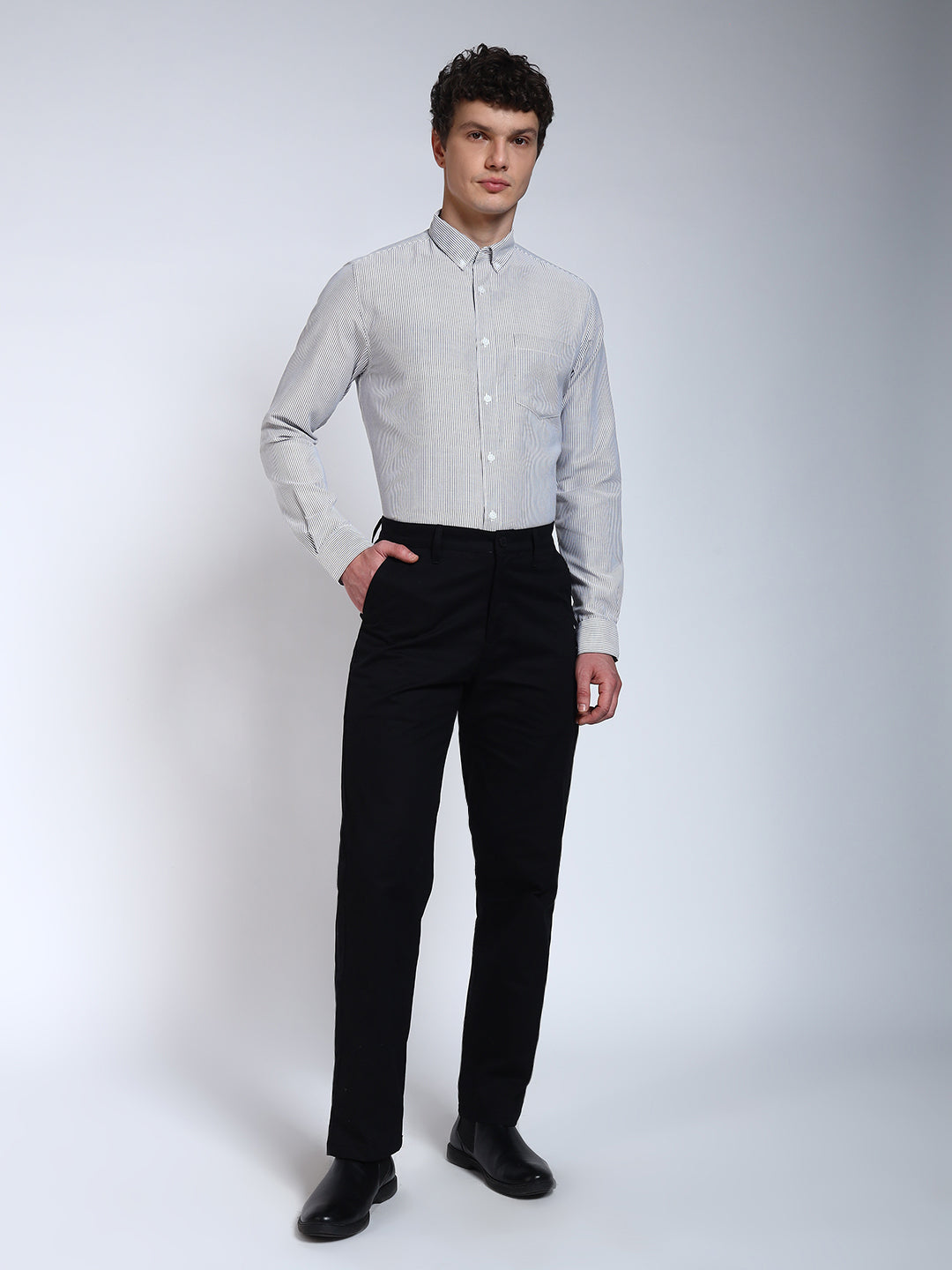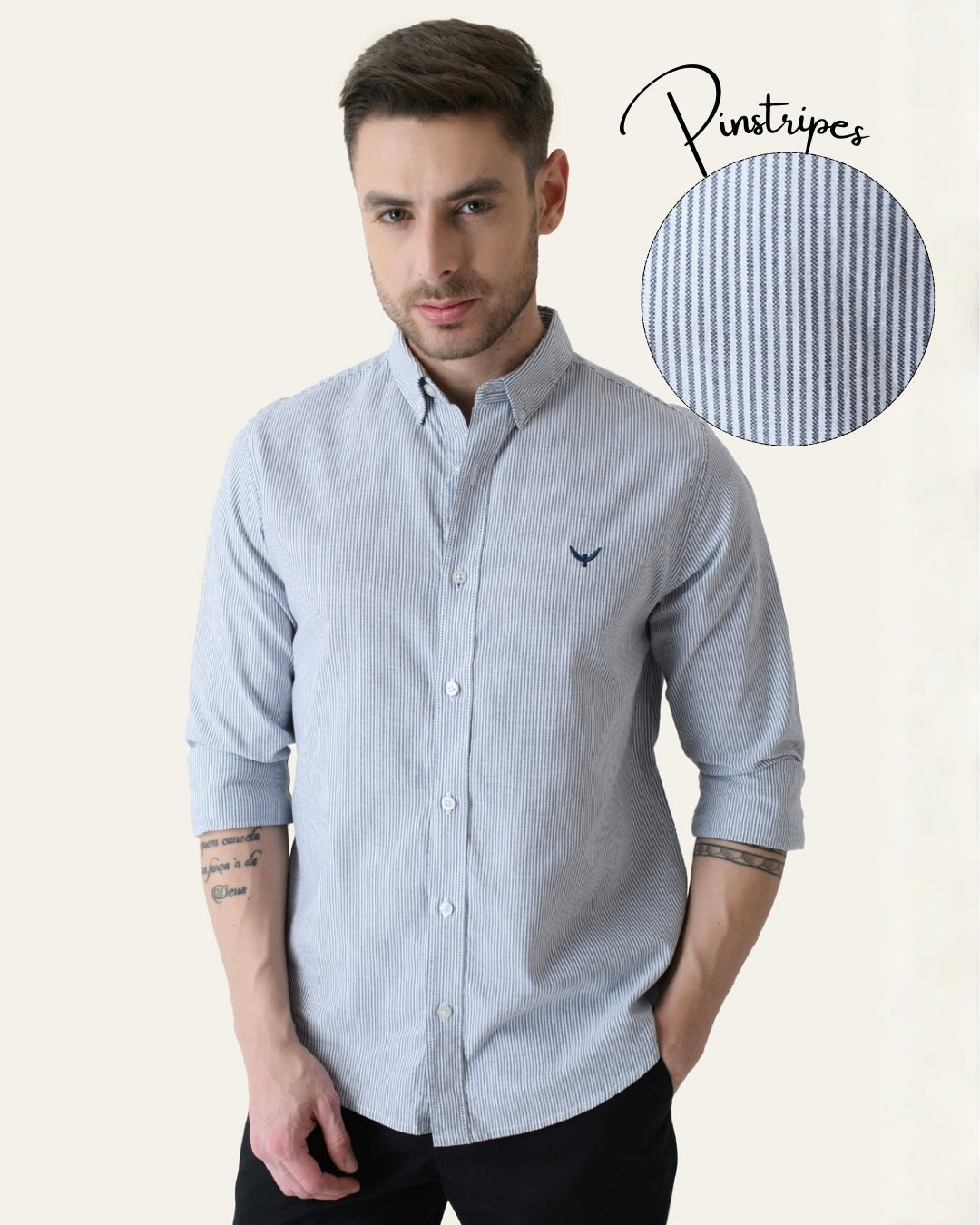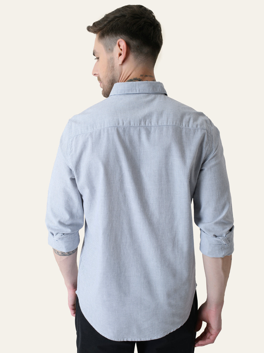 Navy Blue Striped Slim Fit Cotton Shirt. Has a Full Sleeve, Button Down Collar, Cotton Fabric, Front Placket With Curved Hem.