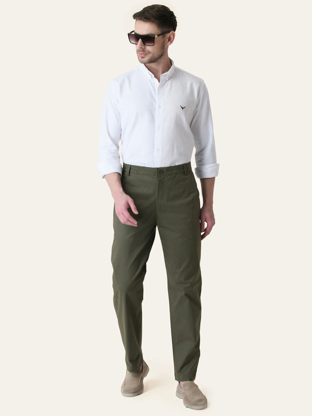 Olive Green Solid Regular Fit Chinos. Has a Flat Front, Two Back Pocket, Two Front Pocket, Button Closure, Zipper Fly and Twill Cotton Fabric.