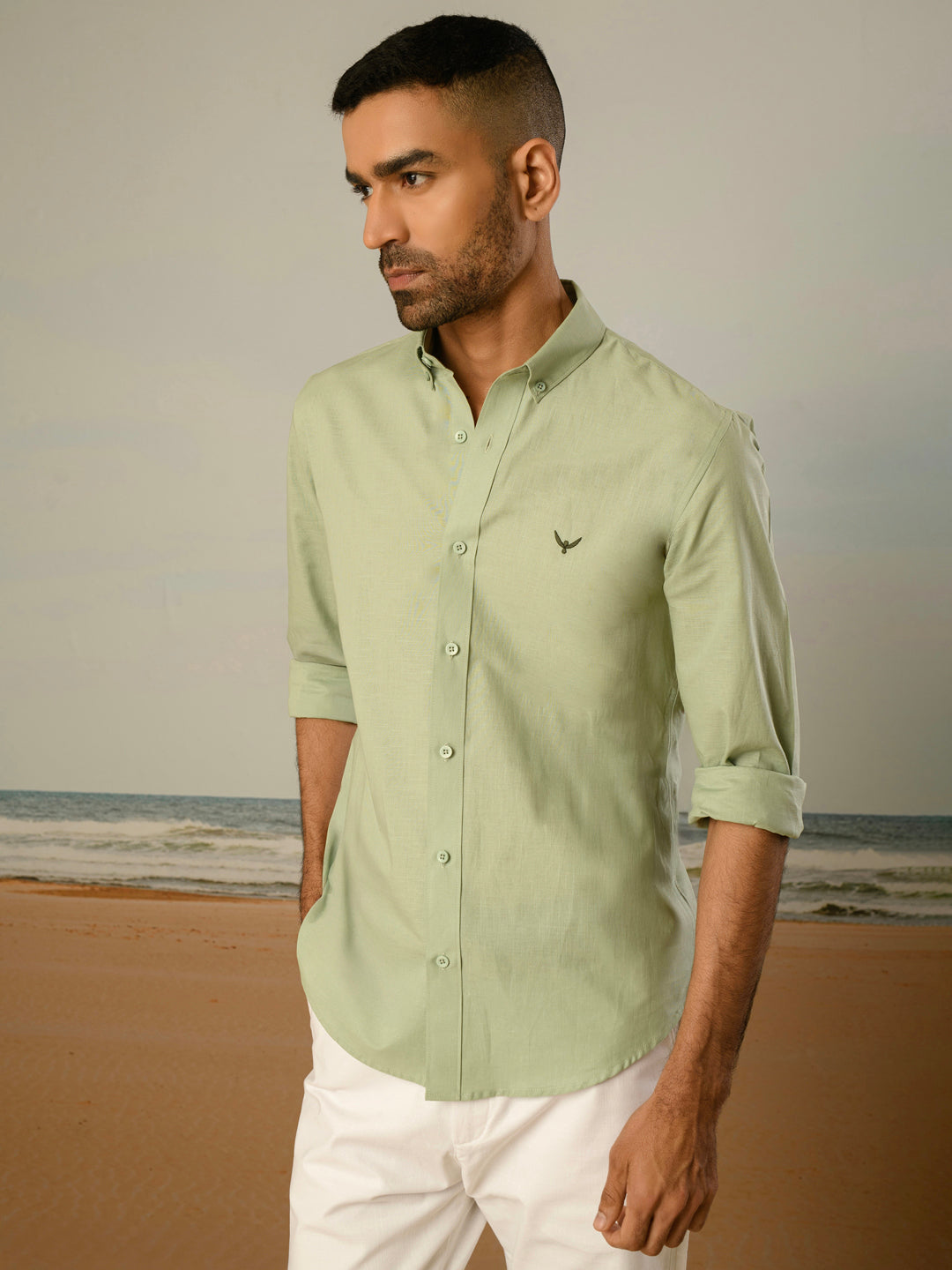 Pista Green Solid Slim Fit Linen Cotton Shirt