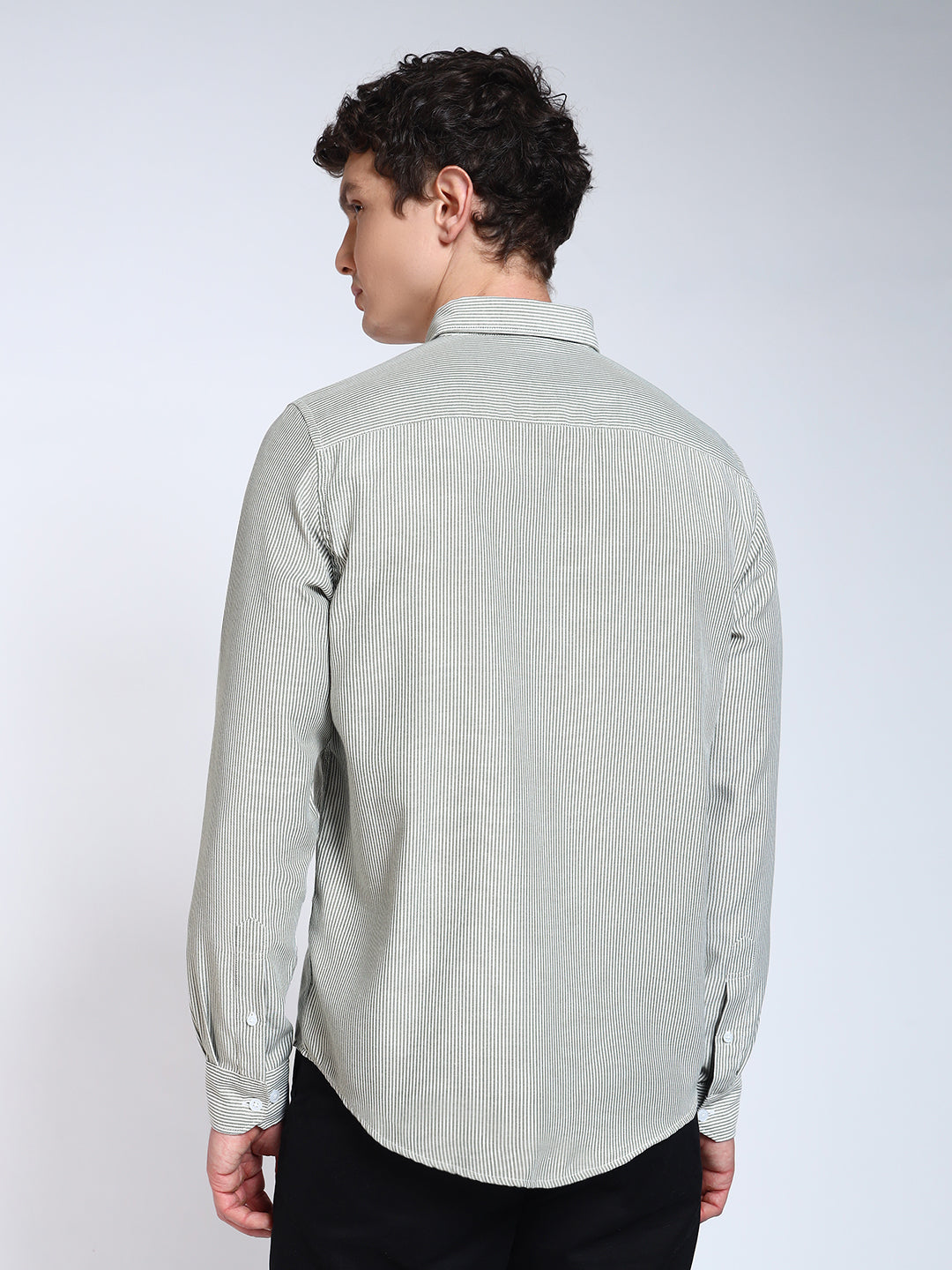 Pista Green Striped Slim Fit Cotton Shirt. Has a Full Sleeve, Button Down Collar, Cotton Fabric, Front Placket With Curved Hem.